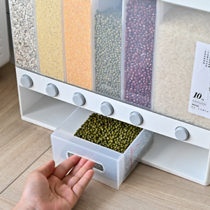 Features: Large capacity, easy storage Bottom funnel design, smooth rice output The rice bucket is composed of multiple parts, which is easy to disassemble and assemble Back hook, can be hung on the wall Activity partition, freely divided