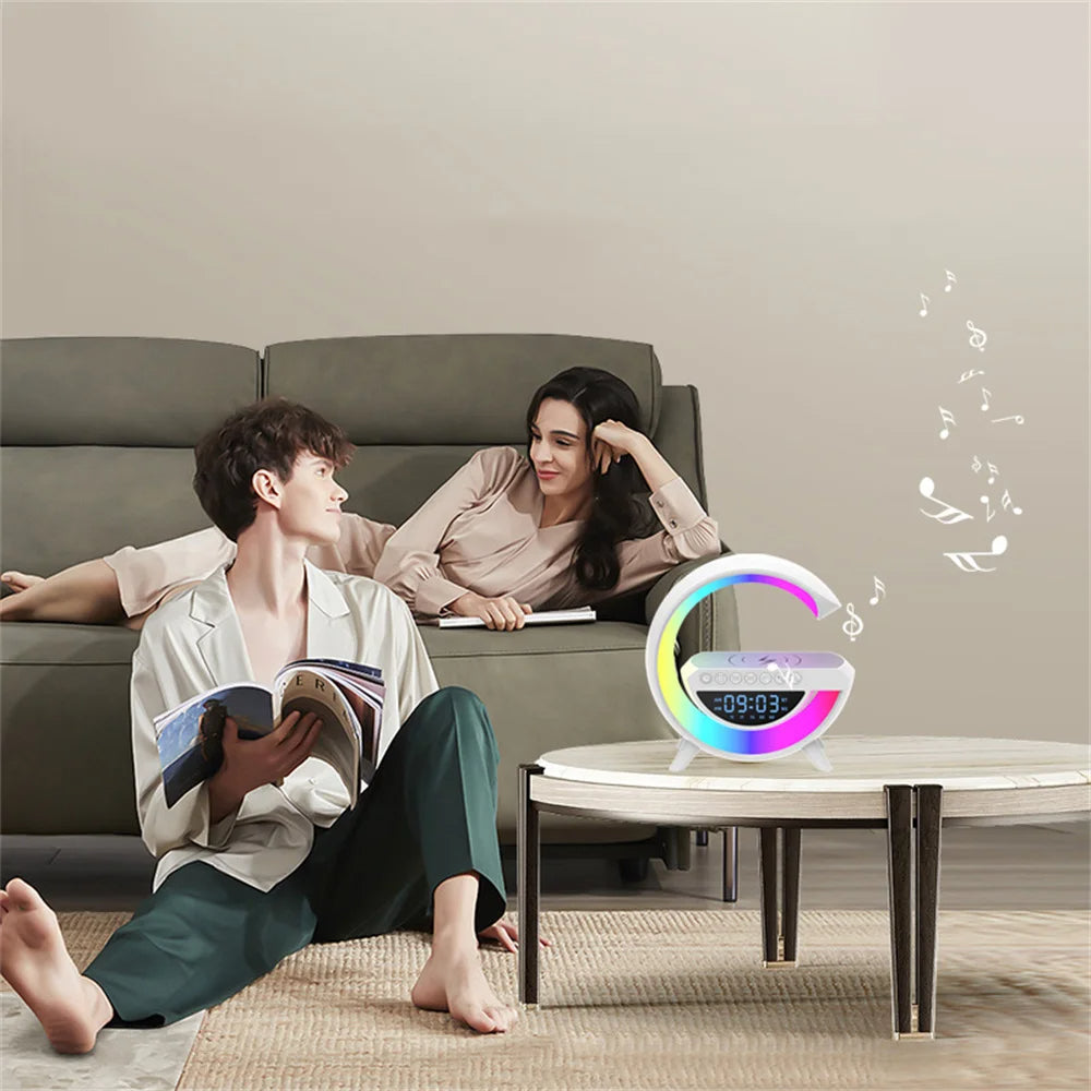 • Multifunctional wireless charger: It has 4 in 1 functions, including Bluetooth speaker, night light, FM Radio, and Fast wireless. Our product team special designs Big “G” fashion-looking, smooth touch, and 6 Mode RGB music sync lamp. 360 ° Surround Sound Sound Generation Structure: The lamp is made of ABS+PC material and the LED digital