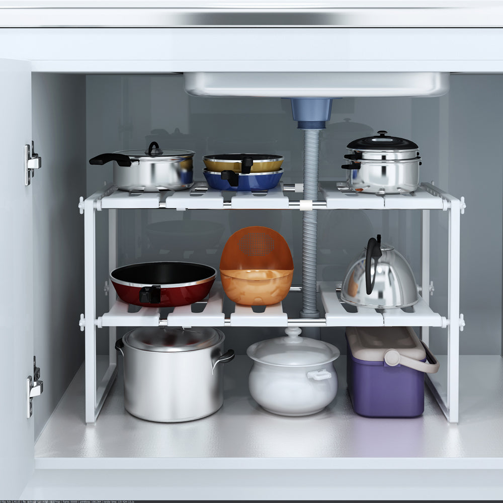 • Adjustable Shelving Design: The length of the storage shelves can be adjustable according to your demands or born to under sink space (kitchen/bathroom), varied configuration allow you get stuff organized around the pipes under the sink.
